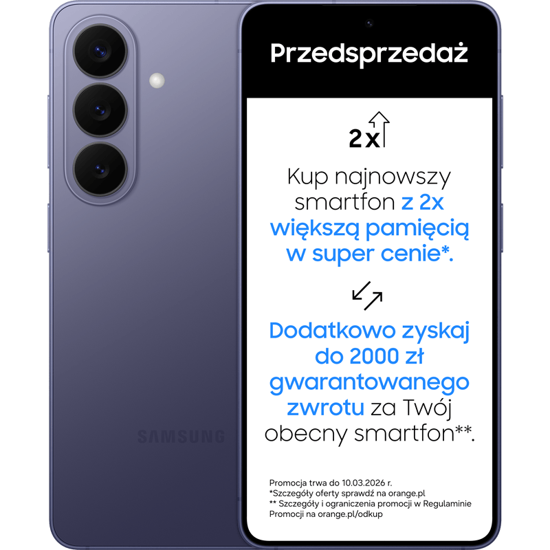 *Kwoty i modele odkupu ustala Organizator Programu Odkup - Breezy Poland. Zależą od modelu i stanu sprzedawanego urządzenia. 2000 zł (w formie elektronicznych bonów płatniczych) to minimalna kwota jaką otrzymasz przy odkupie Samsung Galaxy S24 Ultra (w każdej wersji pamięciowej) w stanie dobrym, bardzo dobrym, idealnym oraz przy zakupie nowego urządzenia z serii Samsung Galaxy S26 w terminie 25.02.2026 do 10.03.2026 r.