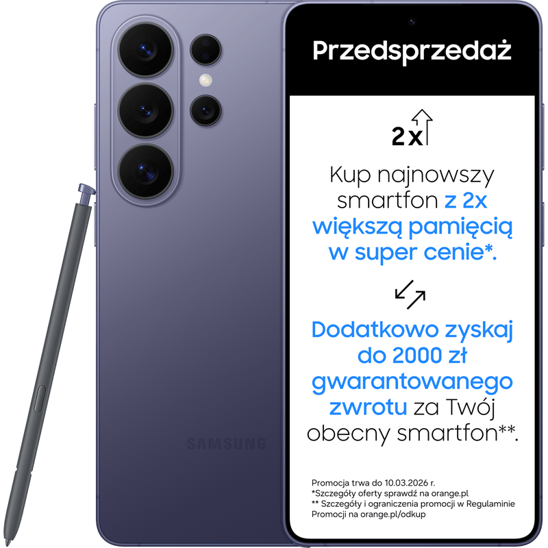 *Kwoty i modele odkupu ustala Organizator Programu Odkup - Breezy Poland. Zależą od modelu i stanu sprzedawanego urządzenia. 2000 zł (w formie elektronicznych bonów płatniczych) to minimalna kwota jaką otrzymasz przy odkupie Samsung Galaxy S24 Ultra (w każdej wersji pamięciowej) w stanie dobrym, bardzo dobrym, idealnym oraz przy zakupie nowego urządzenia z serii Samsung Galaxy S26 w terminie 25.02.2026 do 10.03.2026 r.